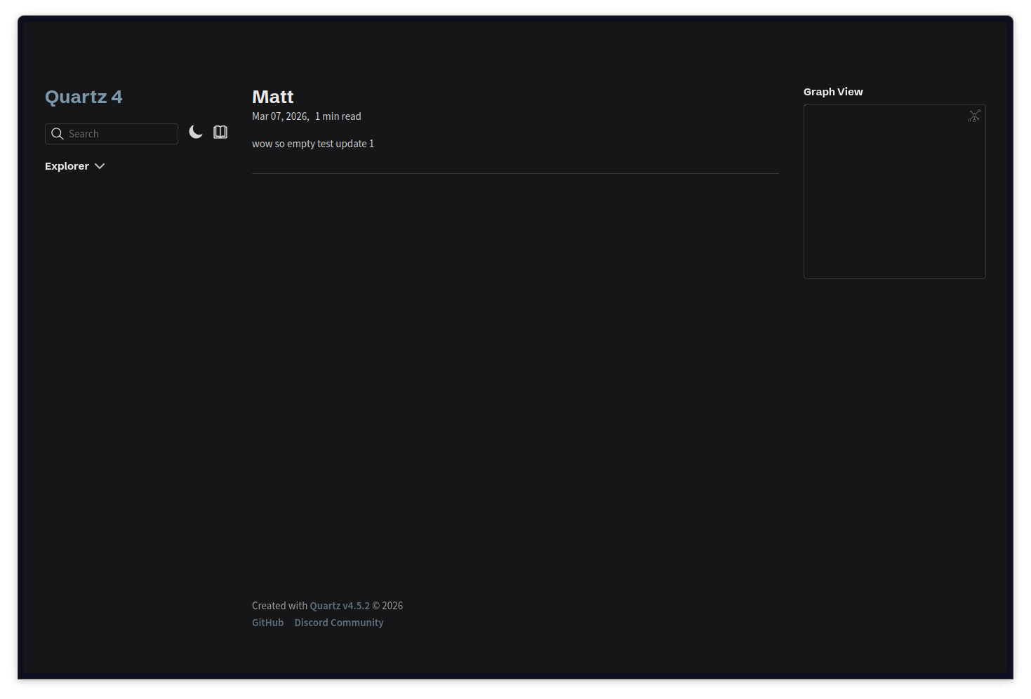 Maintenance is also very easy. Despite Quartz being an NPM package, there is no need to update dependencies or worry about breaking changes. As with any project, I have the option of not updating Quartz and just keeping it as is and keep building static content. If I chose not to update at all, the only thing I would be missing out on are new features and bug fixes.